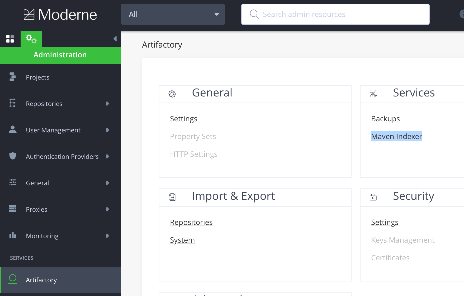 In Artifactory, select the Artifactory link on the left nav and then select Maven Indexer under Services: